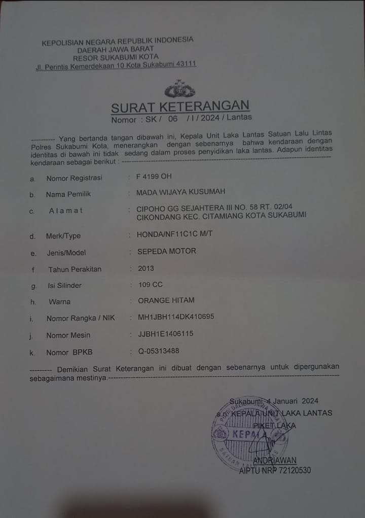 STNK Hilang atas nama Mada Wijaya Kusumah sebagai mana laporan kepihak kepolisian pada 04 Januari 2024: