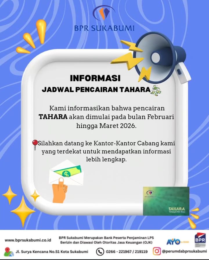 JURNALSUKABUMI.COM – Bank Perekonomian Rakyat (BPR) Sukabumi resmi mengumumkan jadwal pencairan Tabungan Hari Raya (TAHARA) tahun 2026.