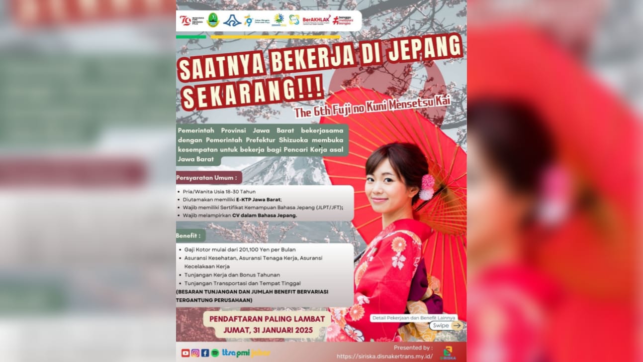 JURNALSUKABUMI.COM – Dinas Tenaga Kerja dan Transmigrasi (Disnakertrans) Kabupaten Sukabumi membuka peluang besar bagi warga Sukabumi untuk bekerja di Jepang. Kesempatan ini merupakan hasil…